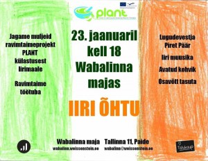 On January 23, 2014 we organized in our center „Irish evening“, where we shared our experiences about PLANT meeting in Ireland. Photos were presented, also overview of Irish workshops and Brigit’s Garden. Our teachers and learners arranged the same cosmetics wokrshops as were organized at Briget’s Garden. About 25 people attended. http://wabalinn.weissenstein.ee/iiri-ohtu/ Photos: http://janvutt.blogspot.com/2014/01/iiri-ohtu.html